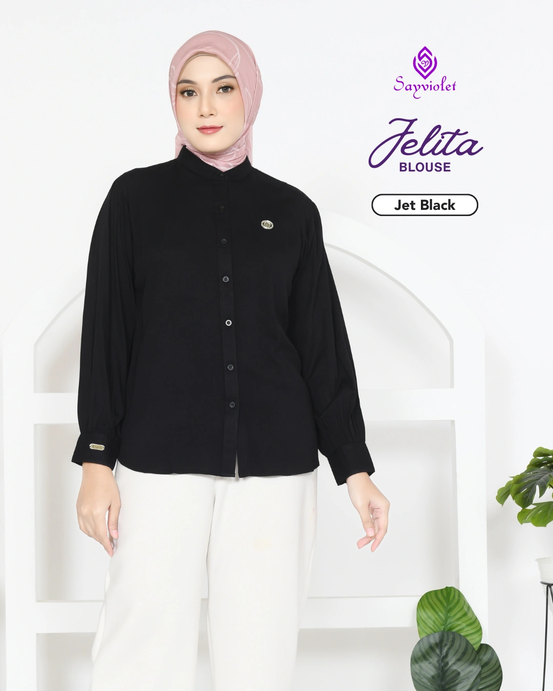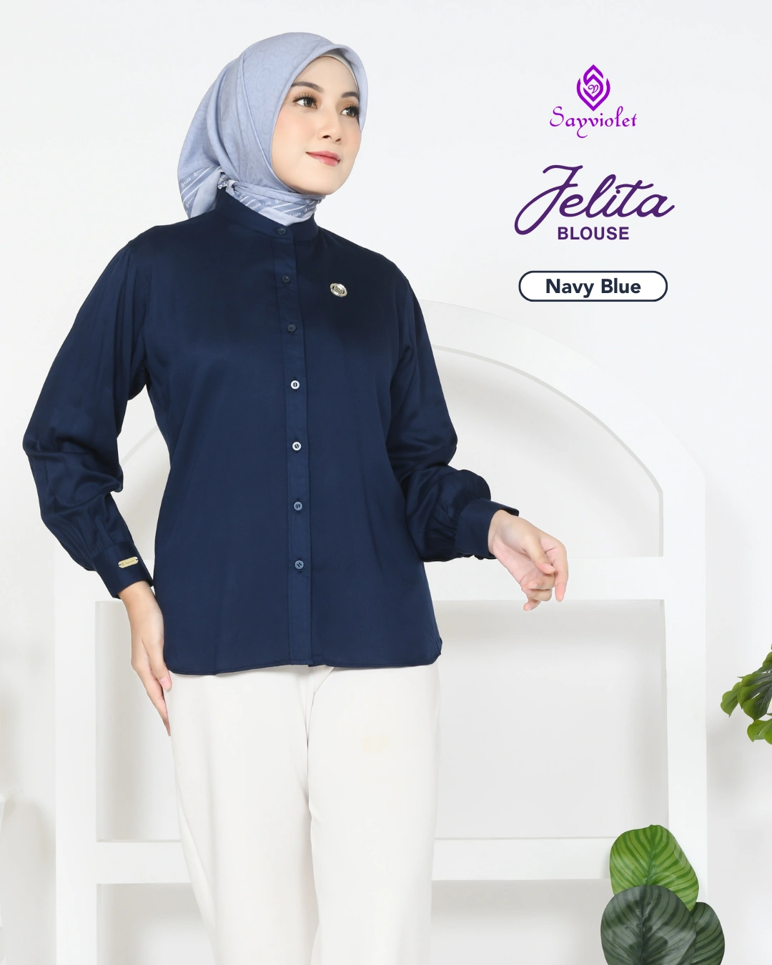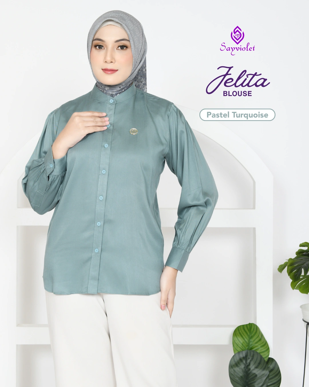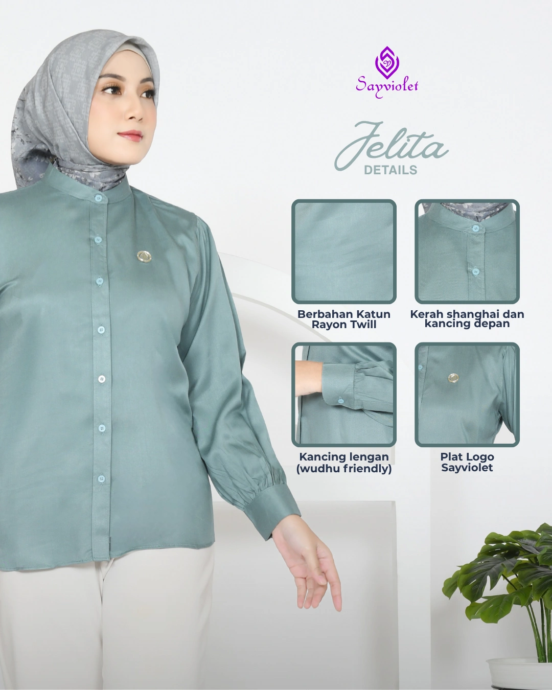 – Kerah shanghai dengan kancing depan, memberi sentuhan rapi dan busui friendly